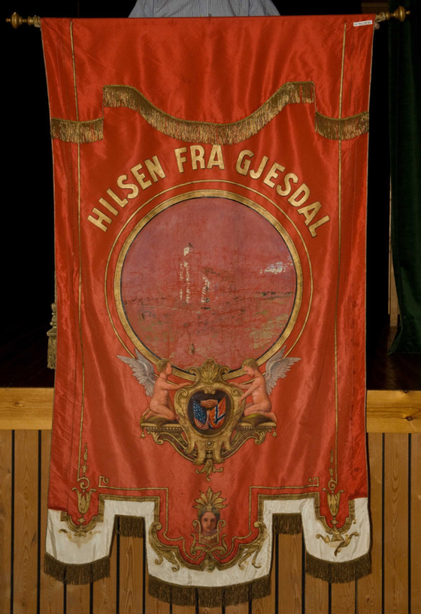 "Den vakre Gjesdalfanen blev brakt fram av hr. Soma fra Canby, Minnesota. Pastor Berge fra East Stanwood i Washington, talte varmt for Gjesdal sogn. Paa fanen var malet bilede av Aalgaards fabriker paa den ene side og kirken paa den anden. De Gjestal buer, som hadde samlet sig rundt fanen stod med tårefyldte øine og lyttet til, hvad pastoren talte over. Mindene gik tilbake til hjemmet der oppe i det vakre Gjestal. De stod og nidstirret paa den vakre fane, snudde og vendte paa den eftersom talerne mindet om de kjendte stedar i bygden. Efter Talen sang forsamlingen og reiste sig under under lagets formands lykkeønskning til Gjestalbuerne".
